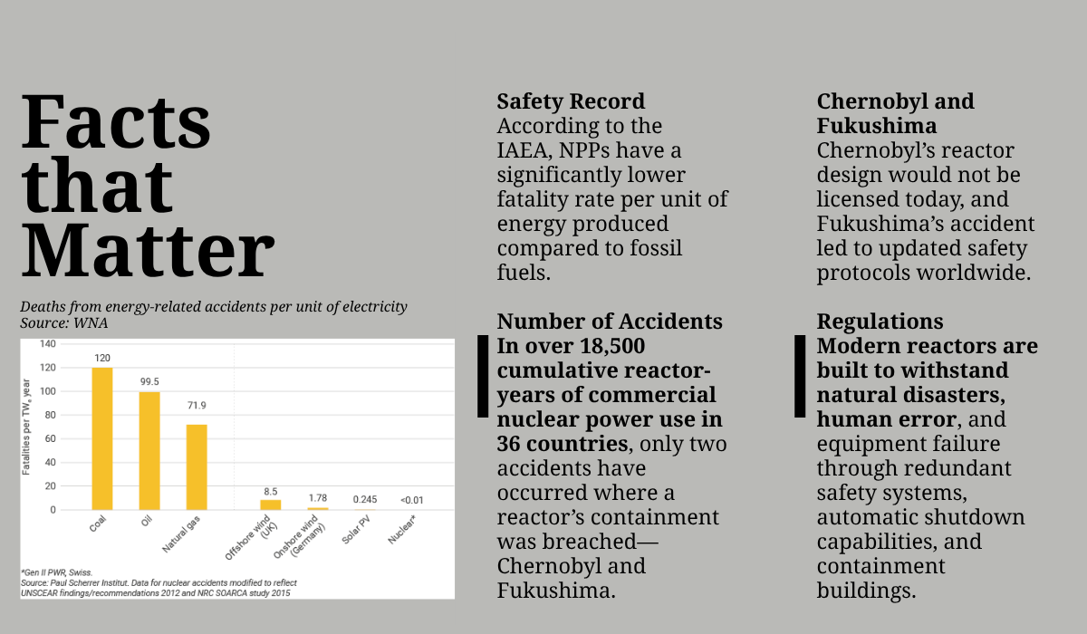 Chernobyl and Fukushima were the result of unique failures: outdated reactor designs, natural disasters, and gaps in safety culture. Since then, the industry has learned, adapted, and implemented sweeping improvements.